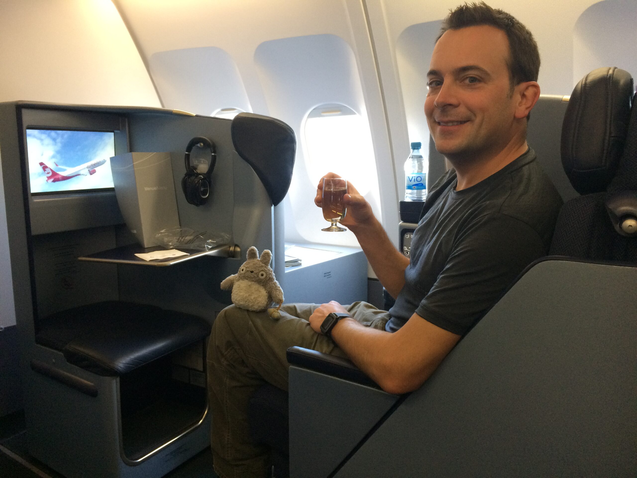 The business-class pampering began at the Admiral’s Club in SFO as we waited to board our flight. It was 6:30am and we started our day with breakfast. Chris also got a complimentary Bloody Mary.