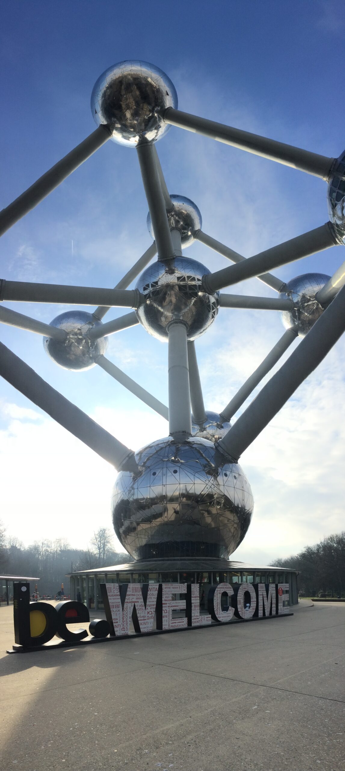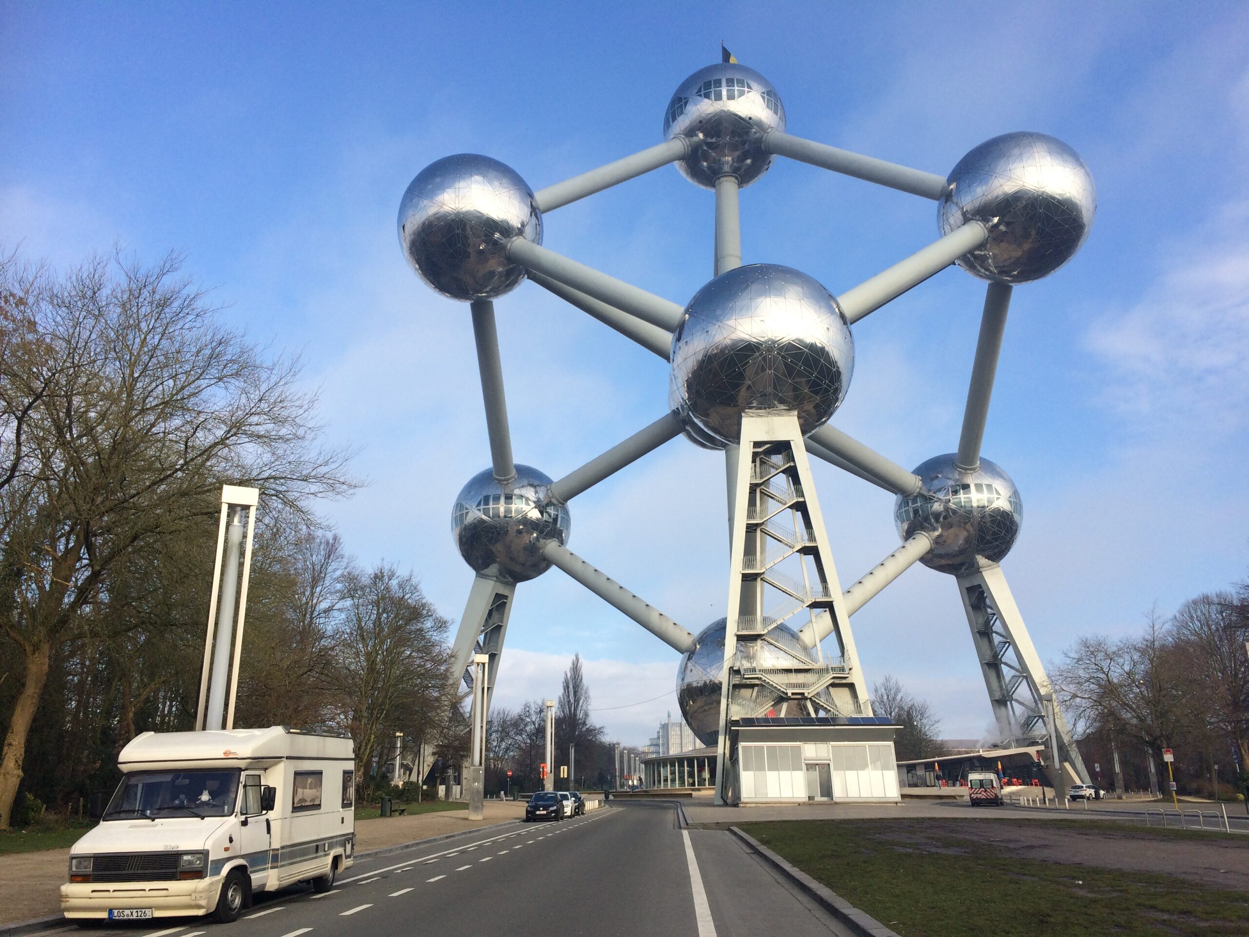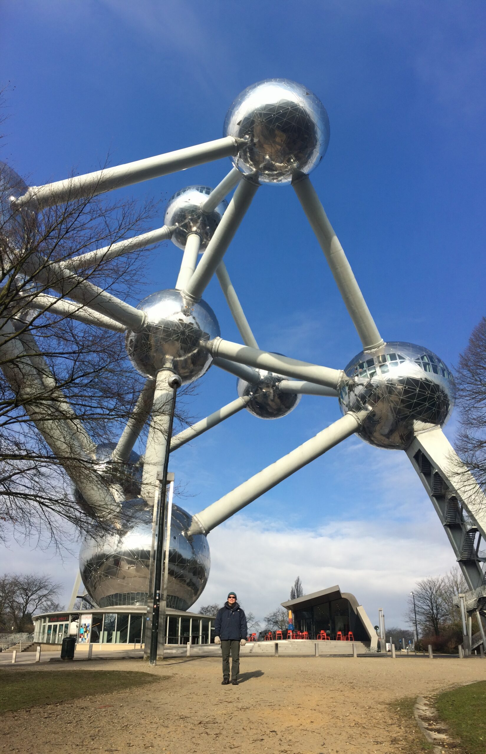 Our final attraction in Brussels was the Atomium several kilometers north of the city, a site not to be missed. Like the Eiffel Tower is to Paris, or the Palace of Fine Arts is to San Francisco, the Atomium is to Brussels. Imagine an iron crystal lattice structure of an atom, only enlarged billions of times. This structure was originally constructed for the 1958 World Fair, but the Belgians loved it too much to take down. Parking was free the first 15 minutes, and 50¢ for the next 30 minutes—plenty of time for just circumnavigating the structure. Otherwise the entrance fee up the escalators into each “ball” was €11.