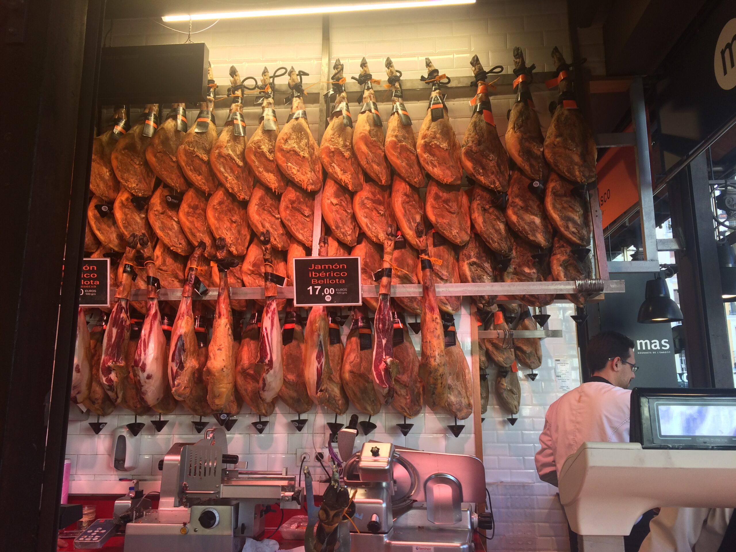 In most if not all tapas bars, the bar man will hand-carve fresh ham directly from a pork leg.  These giant slabs of pork leg, by the way, could be found dangling in storefront windows throughout Madrid.  YUM!