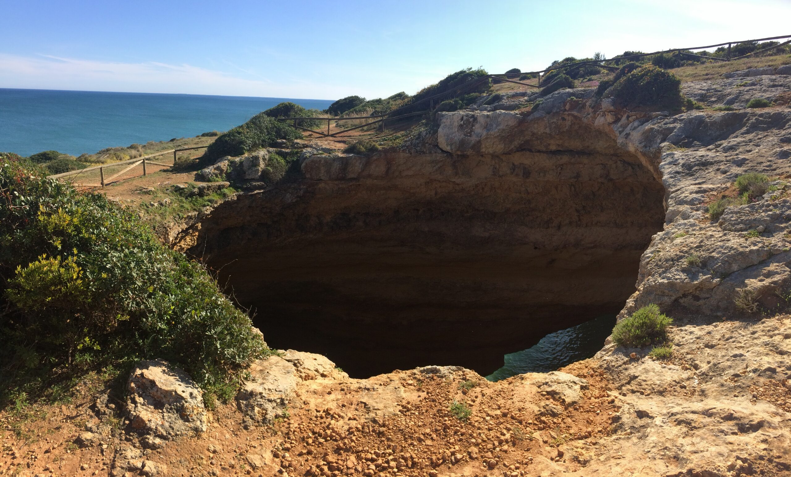 Praia de Benagil wasn’t attractive at all; it was the hike to the neighboring Praia da Marinha that was spectacular. Numerous sinkholes dotted the hike, allowing us to look down into the beach caves from above.