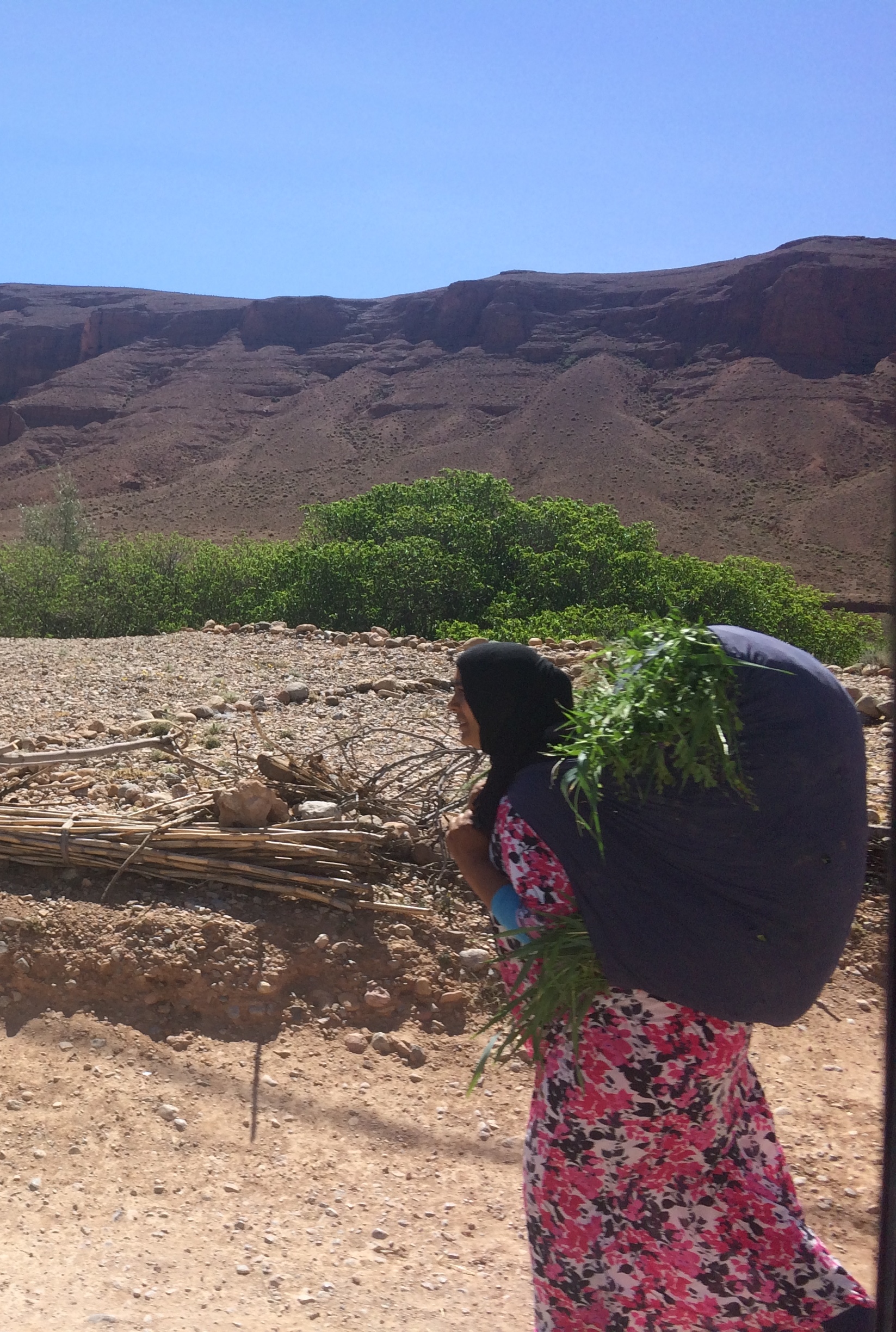 After Todra Gorge, we returned to the main road and headed west for about an hour to Boulmane Dades, the next base town for exploring the Dades Gorge. Another turn off the road led us down the winding valley filled with dramatic scenery. Green trees swayed brilliantly against the bold, red cliffs, and staggering rock formations cast striking shadows. We drove past village after village, waving hello to children and admiring the women harvesting the flower fields.