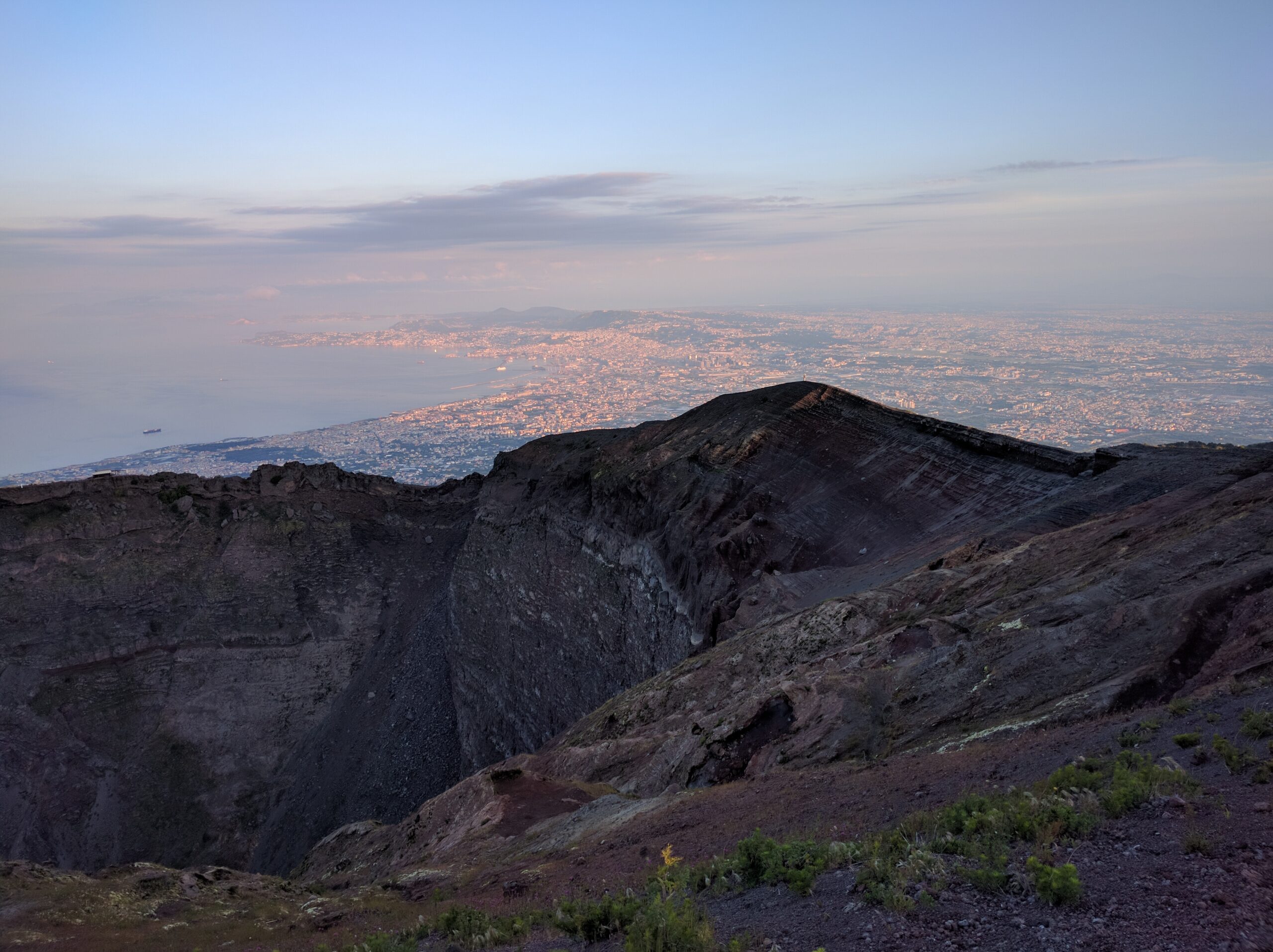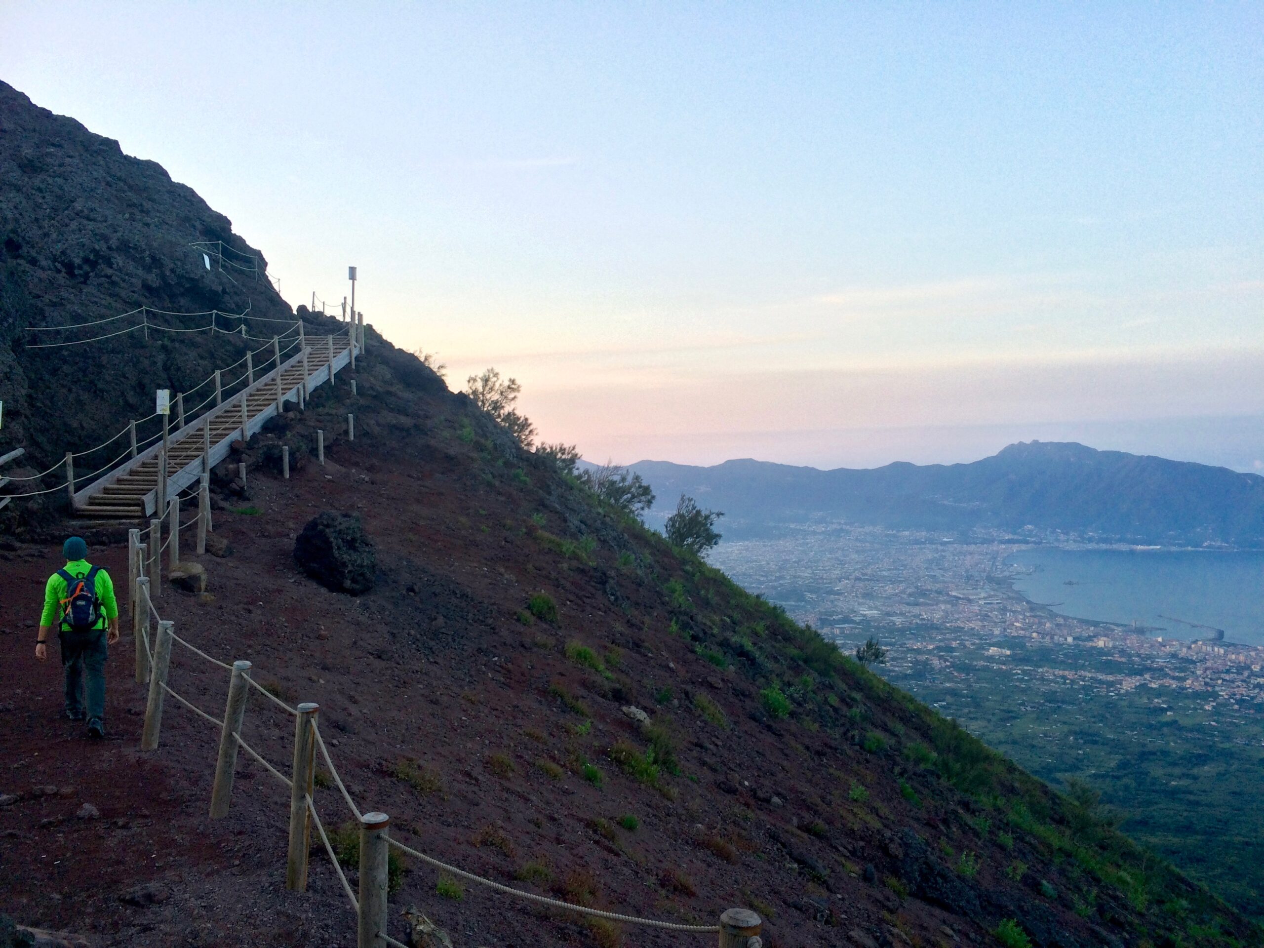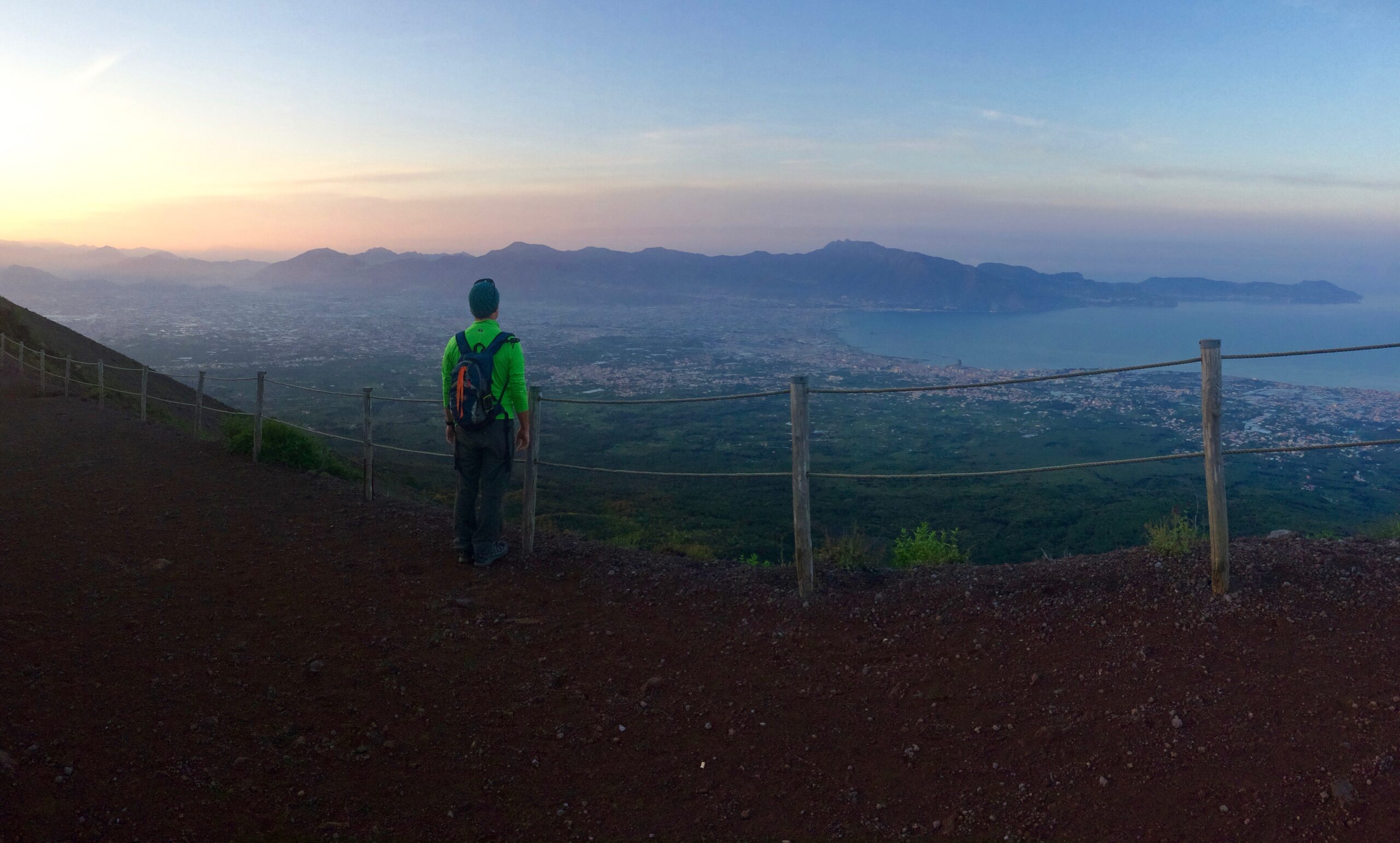 The air was cold and everything was still. Early morning meant clear skies. Naples and Pompeii below were still asleep in darkness, and the typically vibrant Mediterranean spread flat like a blanket. There was not another soul in sight. It was beautiful.