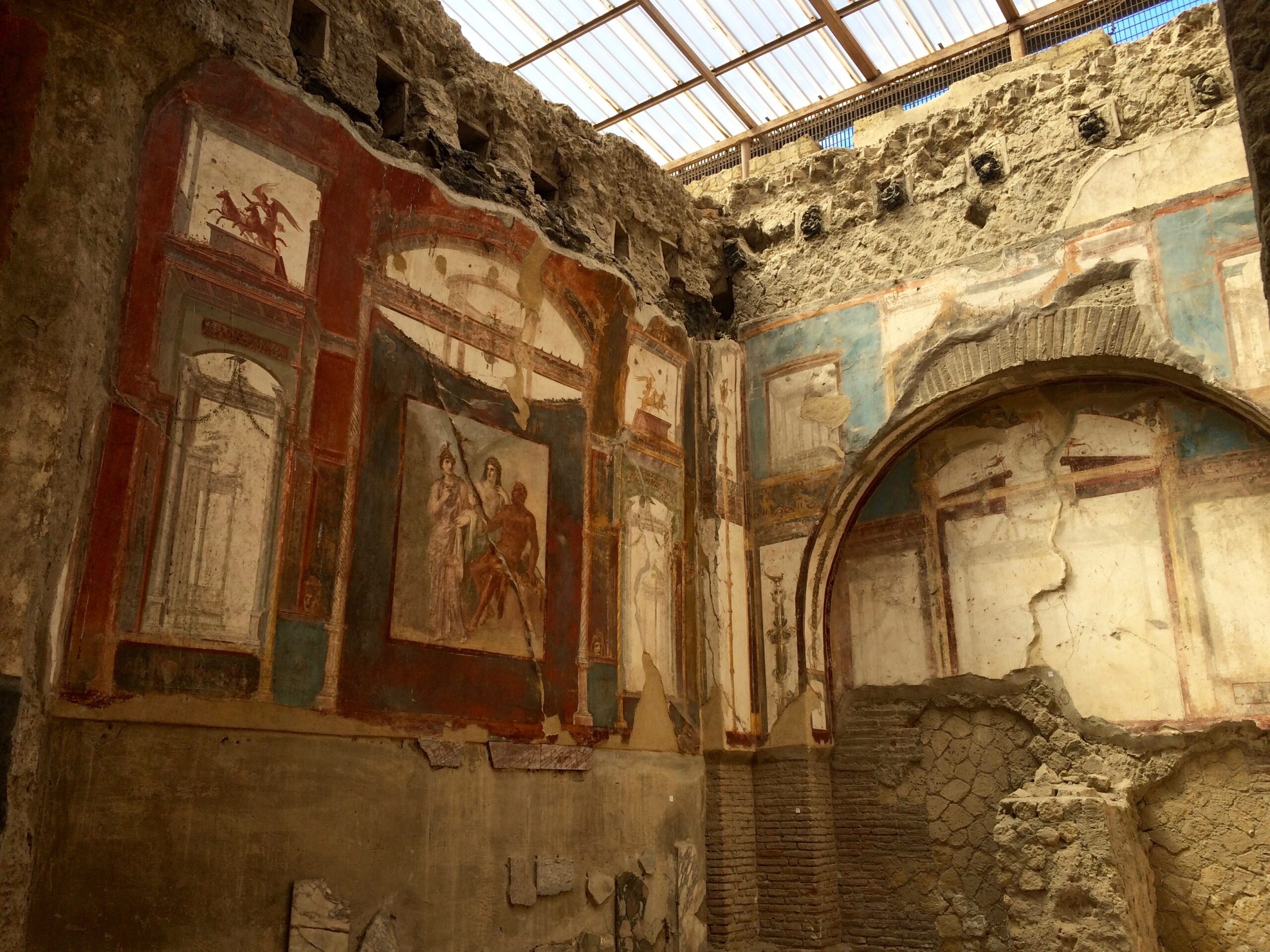 The following day we checked out Herculaneum, the smaller city ruins between Naples and Pompeii. We hopped onto the nearby Circumvesuviana train at the Pompei Scavi stop and rode the line up to Ercolono Scavi for €1.60 each. From the station it was only a 10 minute walk to the ruins. Easy peasy! Not only did exploring these ruins take 1/2 the amount of time as Pompeii’s ruins, there were far fewer people.