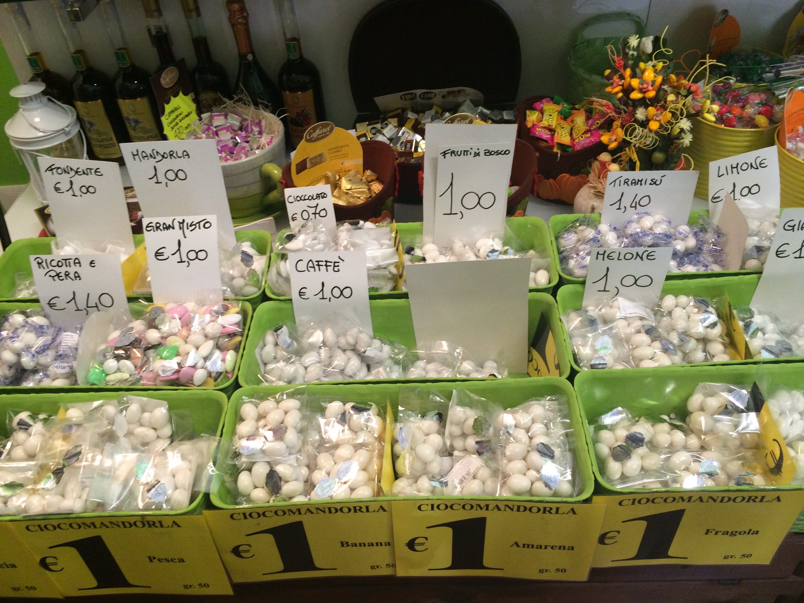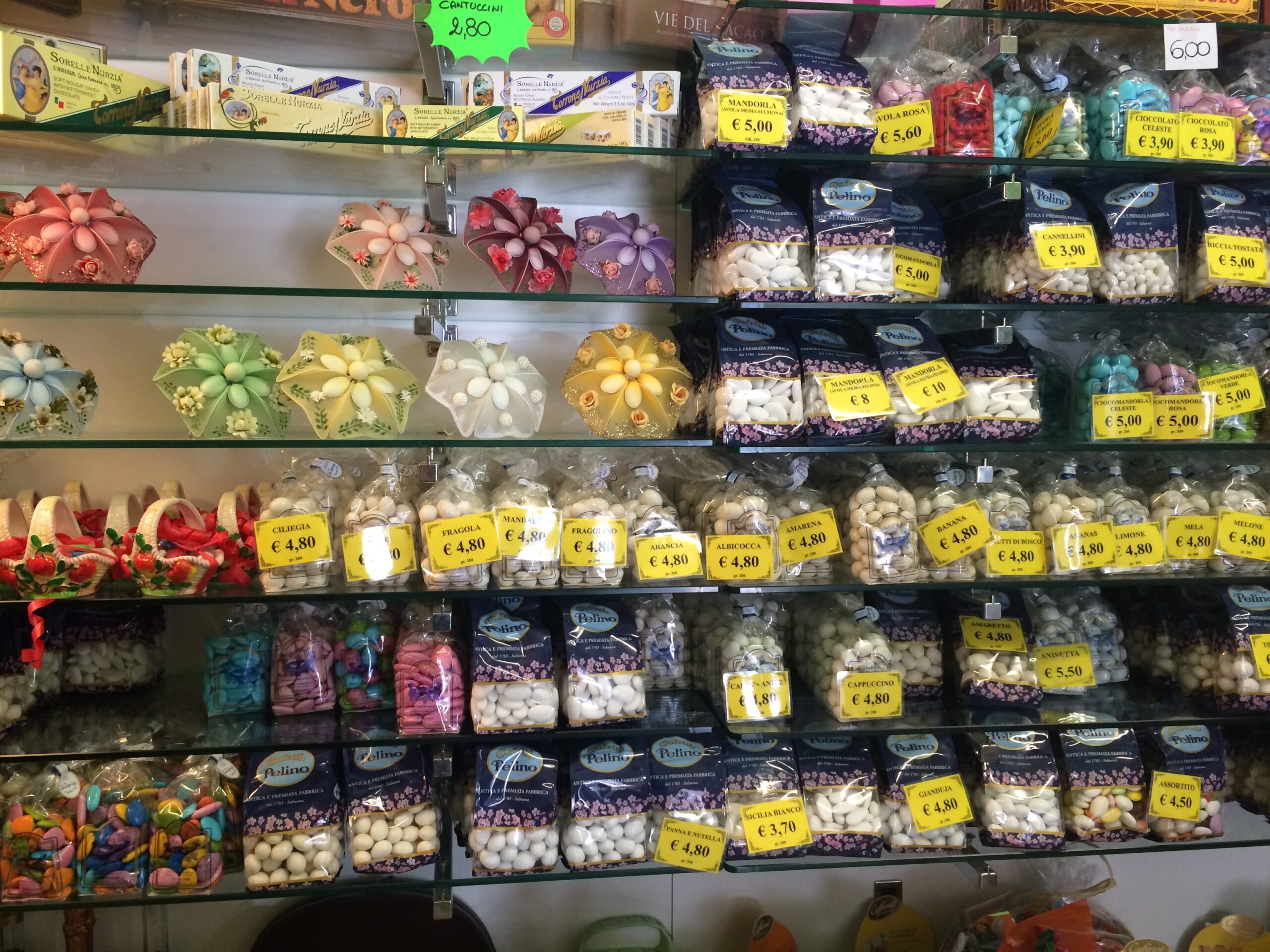 Also famous in Sulmona was the confetti di Sulmona, which I eventually figured out was…candy! And not just any candy…imagine a candy-coated chocolate almond (like an M&M) but instead of chocolate, there are dozens of flavors like orange, vanilla, and coffee. I ended up purchasing chocolate fondue, tiramisu, and ricotta pear. YUM!