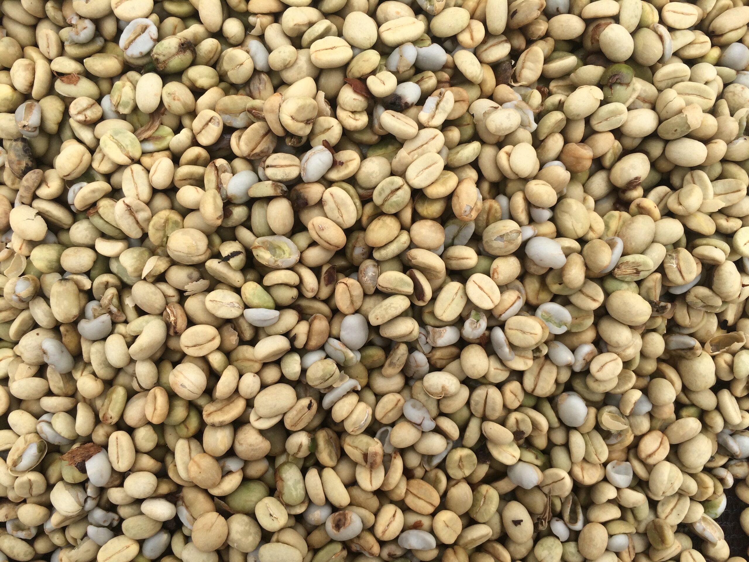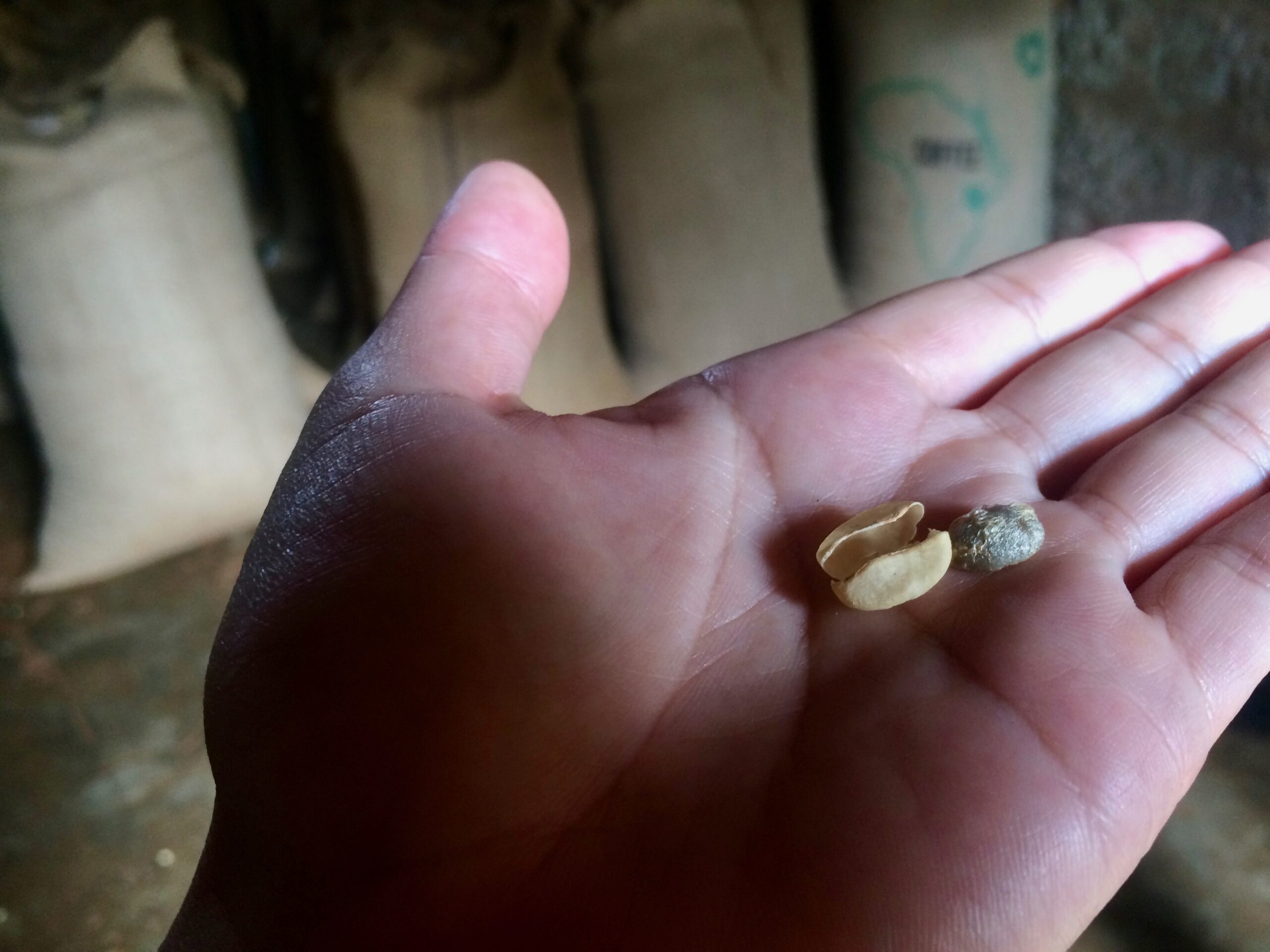 Dried beans, with the final coffee bean (pre-roasted) out of its dried shell in my hand: